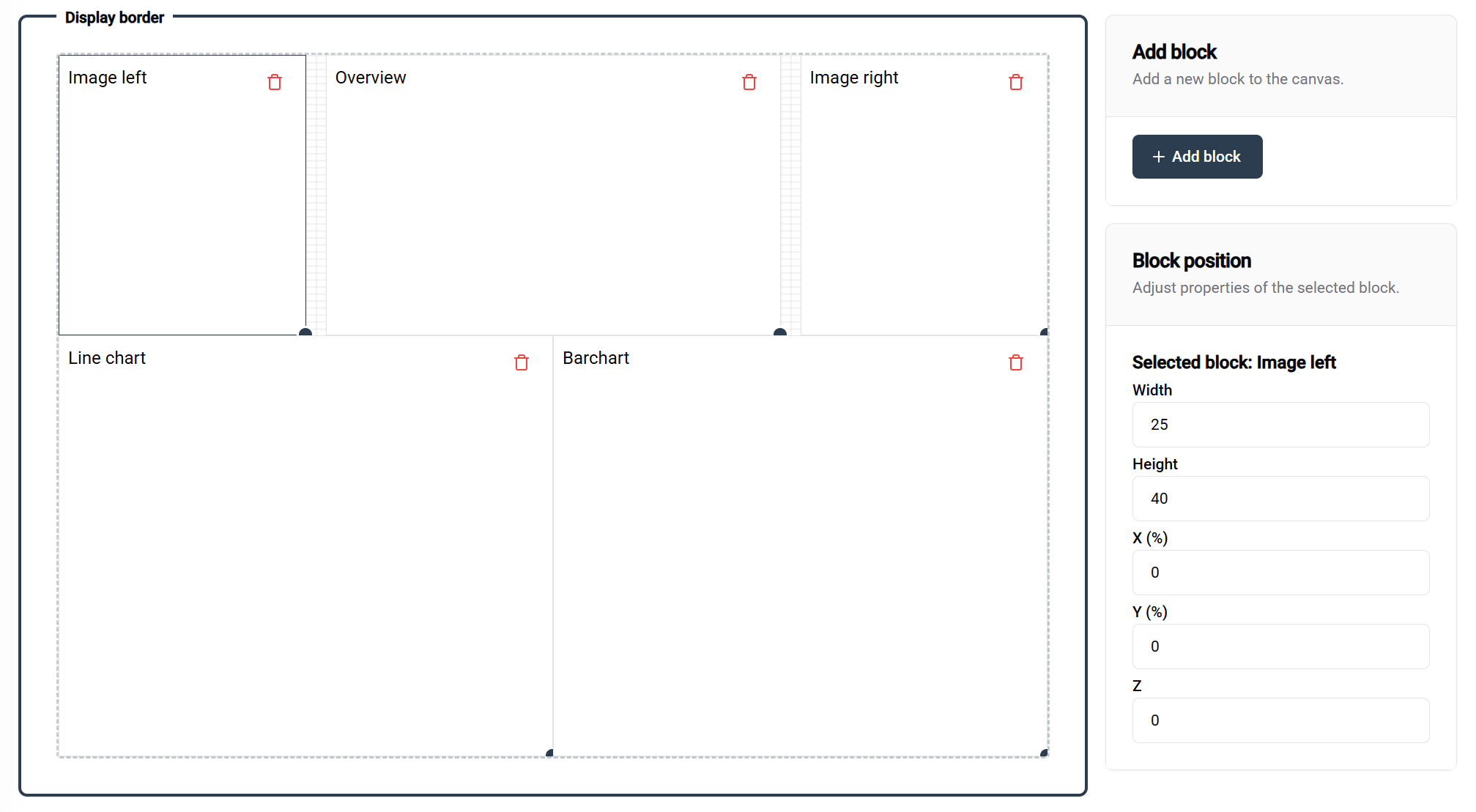 When a block is selected, the right panel provides: